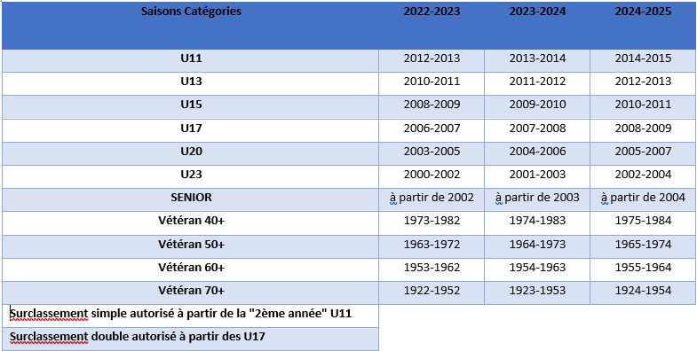 En 2021, les catégories d’âges ont été revues pour un meilleur équilibrage. Ci-dessous, vous trouverez un tableau complet répertoriant les catégories selon les années de naissance et la saison en cours ! À noter que certaines règles de surclassement sont toujours d’application.
